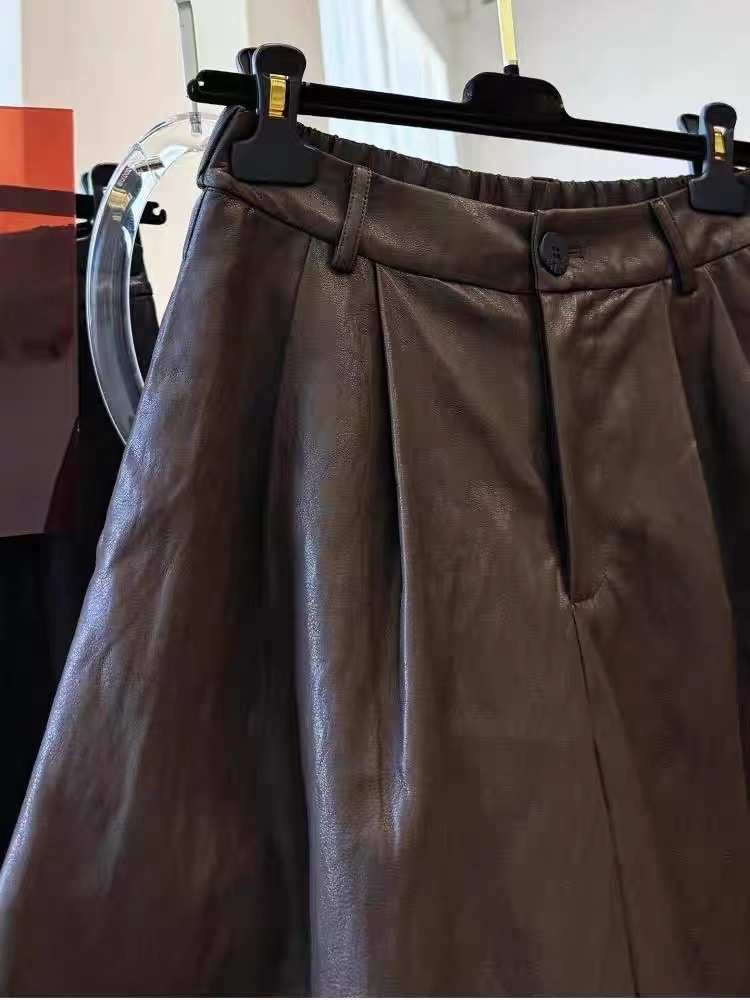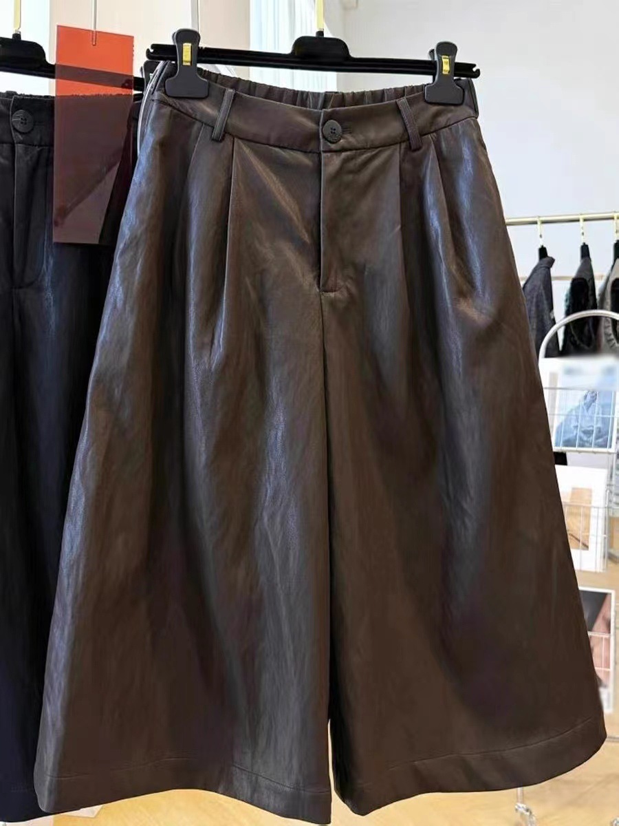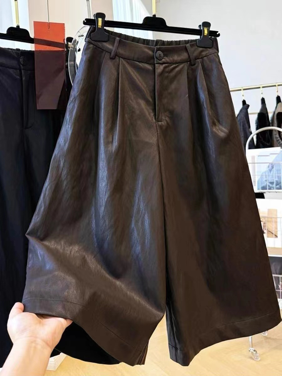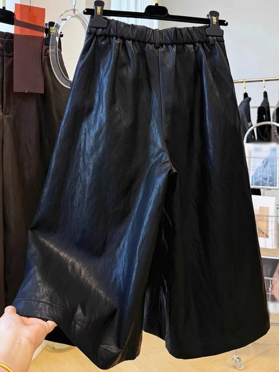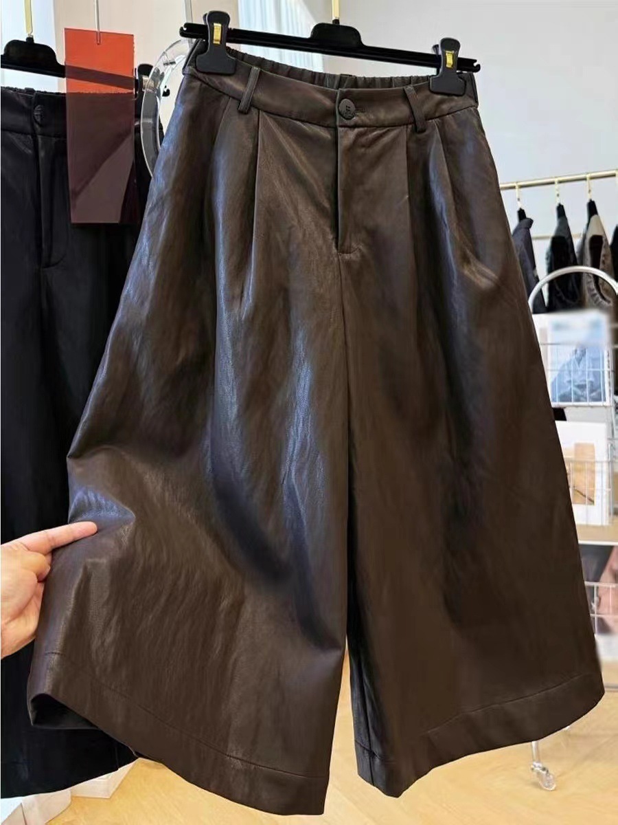 2025 autumn retro casual cropped pants pu leather pants fashion premium elastic loose wide-leg pants women