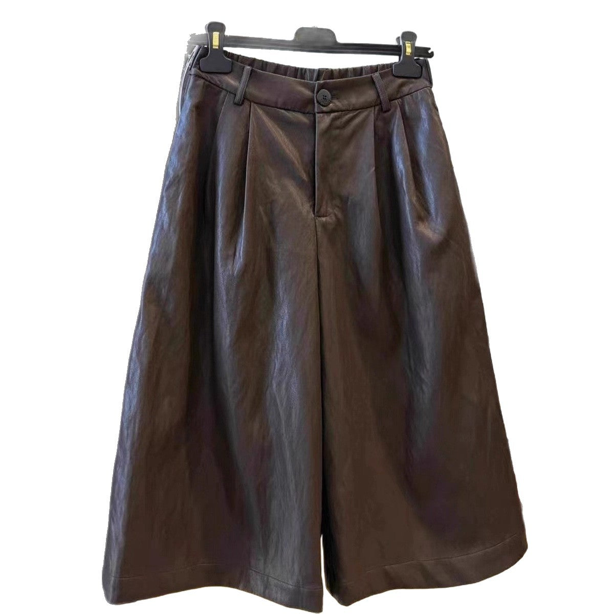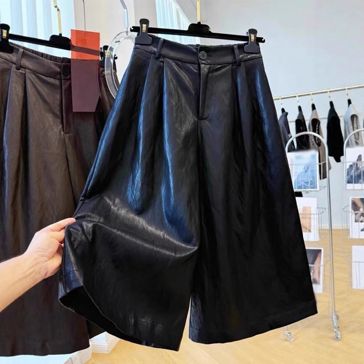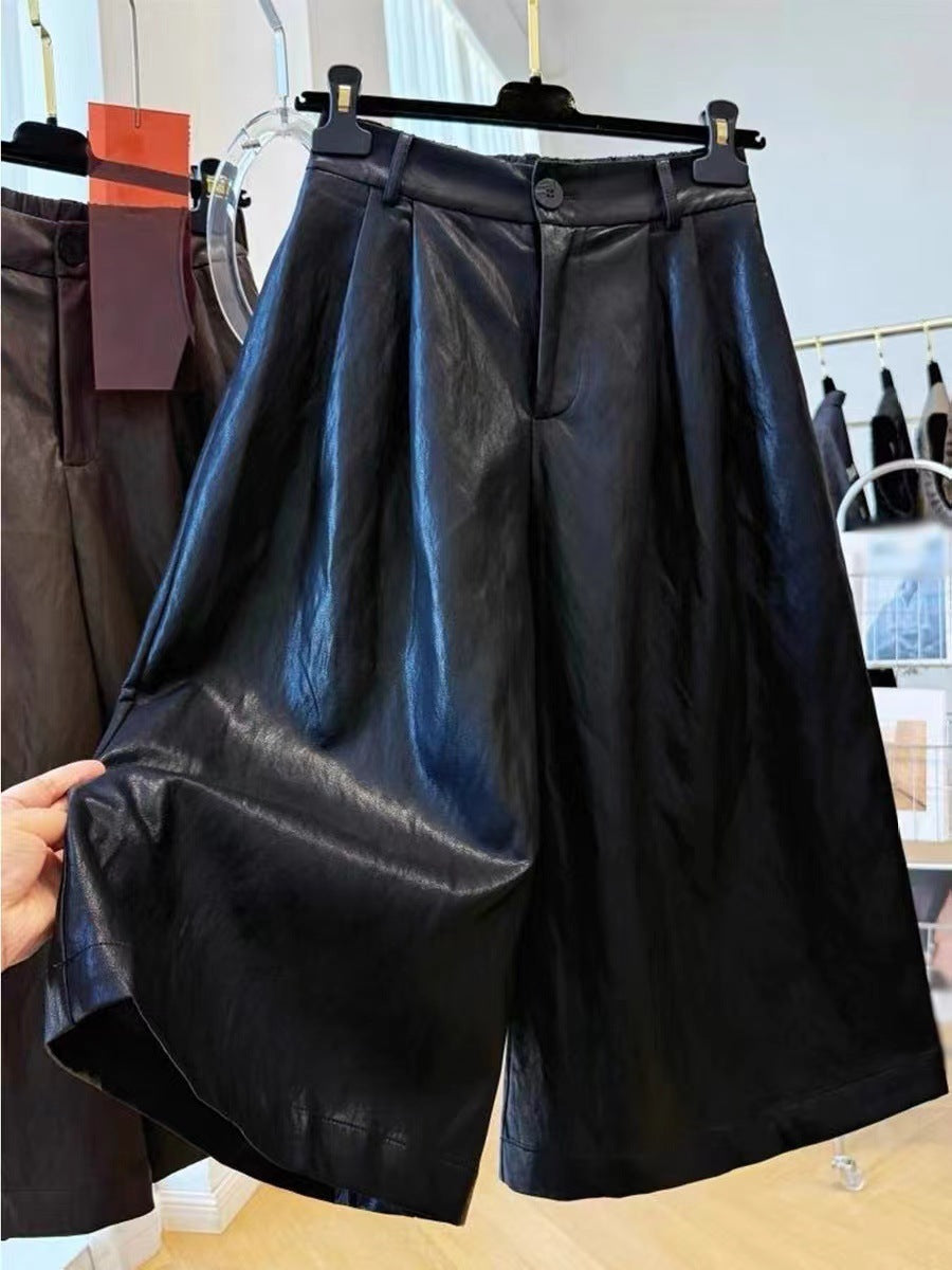 2025 autumn retro casual cropped pants pu leather pants fashion premium elastic loose wide-leg pants women